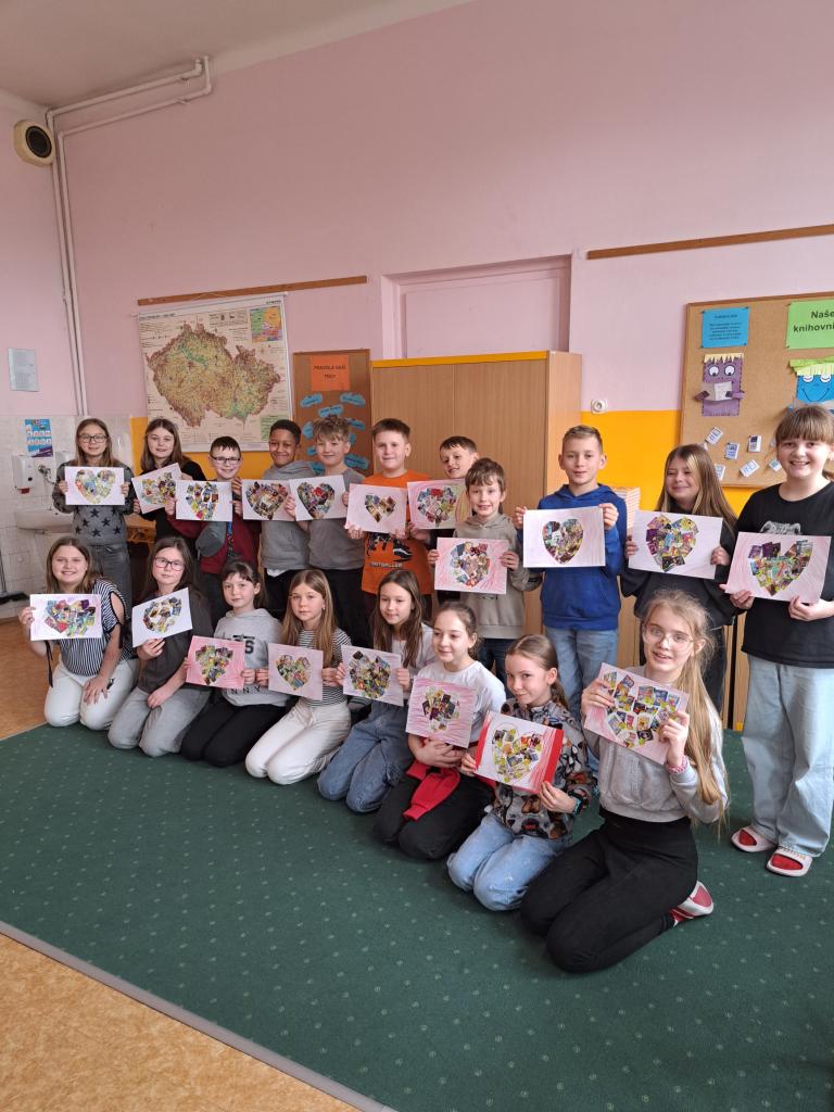Třída 4. A kreslila obrázky do výtvarné soutěže MKK na téma Vdechni knihám druhý život. Své koláže pojaly děti valentýnsky a vystřižené stránky časopisů tvarovaly do srdíček.